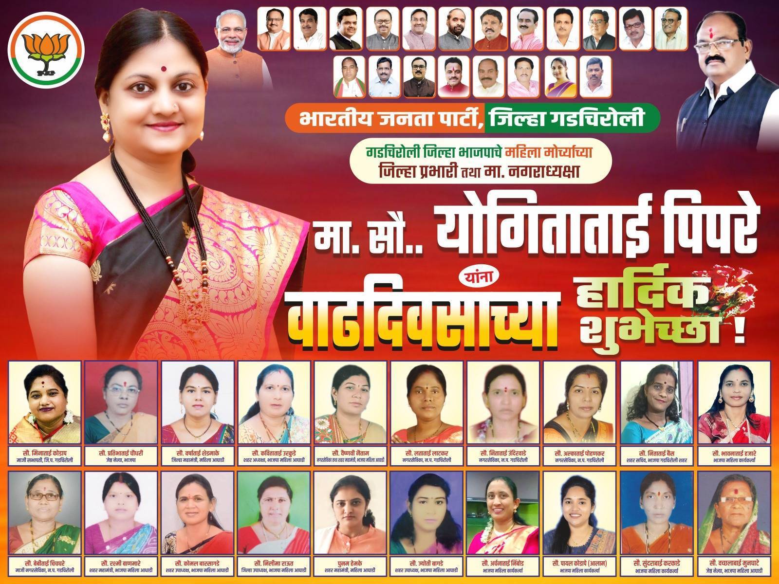 मा.सौ.योगिताताई पिपरे माजी नगराध्यक्ष तथा जिल्हा प्रभारी भाजपा महिला आघाडी, जिल्हा गडचिरोली याना वाढदिवसाच्या हार्दीक शुभेच्छा