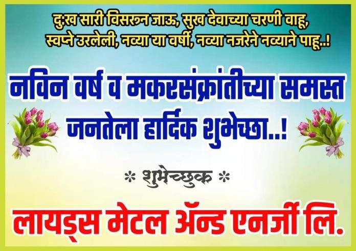 Breaking News नवीन वर्षे व मकरसंक्रांतीच्या सर्व जनतेला हार्दिक शुभेच्छा By vrutt wani - January 1, 2024 72 Share WhatsAppFacebookTelegram नवीन वर्षे व मकरसंक्रांतीच्या सर्व जनतेला हार्दिक शुभेच्छा शुभेच्छूक लायड्ंस मेटल ॲंड एनर्जी