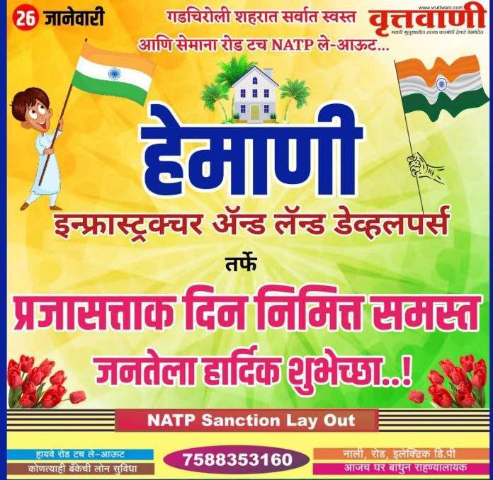 हेमाणी इन्फ्रास्ट्रक्चर ॲन्ड लॅन्ड डेव्हलपर्स तर्फे प्रजासत्ताक दिन निमित्त समस्त जनतेला हार्दिक शुभेच्छा