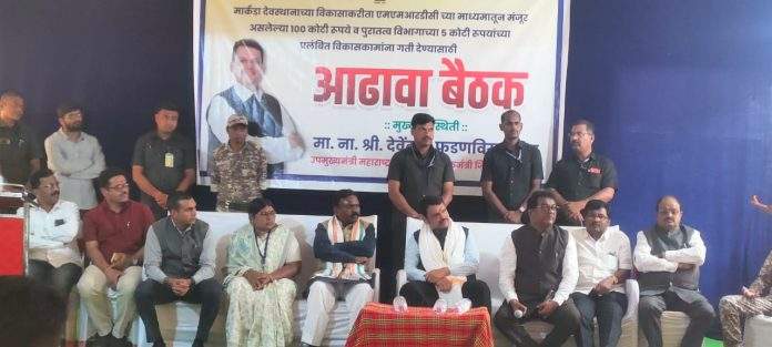 *मार्कंडादेवस्थानाच्या विकासाकरिता एम एम आर डी च्या माध्यमातून मंजूर असलेल्या १०० कोटी रुपये व पुरातत्व विभागाच्या ५ कोटी रुपयांच्या प्रलंबीत विकासकामांना गती देण्यासाठी उपमुख्यमंत्री तथा गडचिरोली जिल्ह्याचे पालकमंत्री मा. देवेंद्रजी फडणवीस यांच्या अध्यक्षतेखाली आढावा बैठक पार पडली.*
