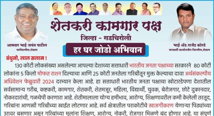शहरातील फुटपाथ दुकाने, घरकुल, अतिक्रमणे कायम करून प्रॉपर्टी कार्ड मिळणे, रस्ते, नाल्या, पिण्याच्या पाण्याची सोय यासारख्या समस्यांचे निवारण होणे आवश्यक आहे. अशा स्थितीत स्वातंत्र्यपूर्व काळापासून सत्तेच्या राजकारणापेक्षा भांडवलदार, कारखानदारां विरोधात सरकारशी सामान्य माणसांसाठी विधिमंडळात आणि रस्त्यावरचा संघर्ष करणाऱ्या शेतकरी कामगार पक्षाच्या लाल झेंड्याखाली एकत्र येऊन आवाज बुलंद करण्याची आता वेळ आलेली आहे. त्यासाठी गडचिरोली शहरातील गरीब सामान्य शेतकरी, कष्टकरी, कामगार, शेतमजूर, छोटे दुकानदार, नोकरदार, महिला, विद्यार्थी – बेरोजगार युवकांनी मोठ्या संख्येने आपापल्या वार्ड शाखेचे मोठ्या संख्येने सभासद होऊन एकत्र यावे, असे आवाहन जिल्हा चिटणीस भाई रामदास जराते, जिल्हा खजिनदार भाई शामसुंदर उराडे, महिला नेत्या जयश्री जराते, युवक आघाडीचे जिल्हाध्यक्ष भाई अक्षय कोसनकर, जिल्हा समितीचे सदस्य डॉ. गुरुदास सेमस्कर, रेश्मा रामटेके, विजया मेश्राम, छाया भोयर, रजनी खैरे, शुल्का बोबाटे, संगिता बोदलकर, अस्मिता लाटकर, धारा बन्सोड, कुसूम नैताम, पुष्पा कोतवालीवाले, योगेश चापले, भीमदेव मानकर, राजकुमार प्रधान, बाबुलाल रामटेके, विनोद उराडे, अंकुश मारभते, भूषण चिंचोलकर यांनी केले आहे.