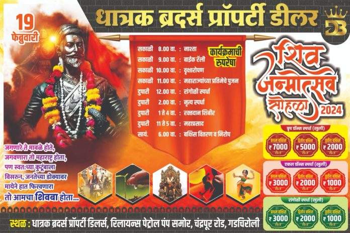 धात्रक ब्रदर्स प्रॉपर्टी डीलर तर्फे 19 तारखेला शिवजयंती निमित्ताने दरवर्षीप्रमाणे शिवजन्मोत्सववाच्या निरनिराळ्या कार्यक्रमाचे आयोजन धात्रक ब्रदर्स डीलर्स रिलायन्स पेट्रोल पंप समोर चंद्रपूर रोड,गडचिरोली येथे आयोजित करण्यात आलेले आहे.