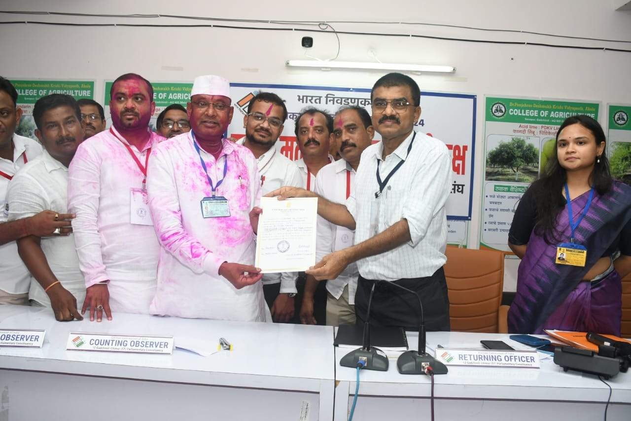 गडचिरोली,दि.4: 12 – गडचिरोली- चिमुर (अ.ज.) लोकसभा मतदारसंघ निवडणूकीत इंडियन नॅशनल काँग्रेसचे डॉ. नामदेवराव किरसान हे विजयी झाले आहेत. त्यांना एकूण 6 लाख 17 हजार 792 मते प्राप्त झाली. जिल्हाधिकारी तथा निवडणूक निर्णय अधिकारी संजय दैने यांनी हा निकाल जाहिर केला. डॉ. किरसान यांना निवडणूक निर्णय अधिकाऱ्यांच्या हस्ते प्रमाणपत्र देण्यात आले. जिल्हा परिषदेच्या मुख्य कार्यकारी अधिकारी आयुषी सिंह यावेळी उपस्थित होत्या.