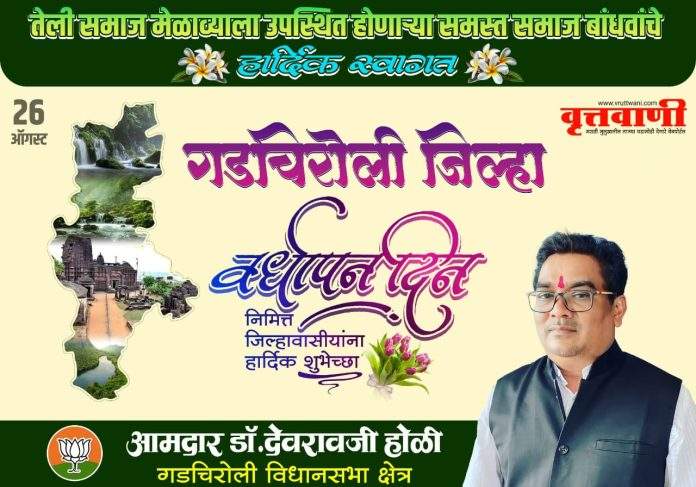 Breaking News गडचिरोली जिल्हा वर्धापन दिनाच्या समस्त जनतेला हार्दिक शुभेच्छा By vrutt wani - August 26, 2024 56 Share WhatsAppFacebookTelegram गडचिरोली जिल्हा वर्धापन दिनाच्या समस्त जनतेला हार्दिक शुभेच्छा शुभेच्छुक आमदार डॉ देवरावजी होळी गडचिरोली विधानसभा क्षेत्र