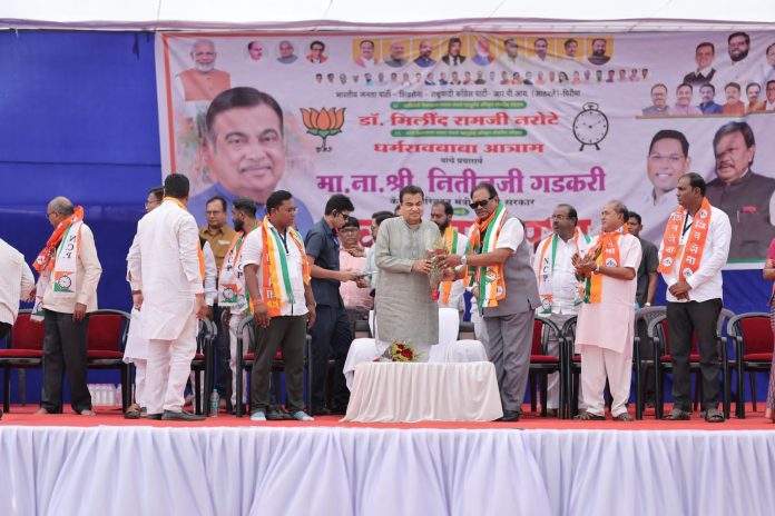 अहेरी विधानसभा मतदार संघाचे राष्ट्रवादी काँग्रेस, भाजपा, शिवसेना महायुतीचे उमेदवार धर्मरावबाबा आत्राम यांच्या प्रचार सभेमध्ये शुक्रवारी (ता.१५) आष्टी येथे नितीन गडकरी बोलत होते. मंचावर धर्मरावबाबा आत्राम, माजी आमदार नामदेवराव उसेंडी यांच्यासह अनेक पदाधिकारी उपस्थित होते.
