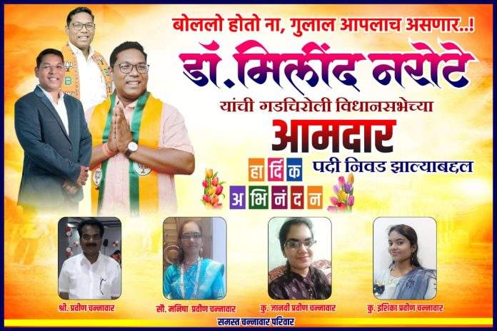 Breaking News डॉ. मिलिंद नरोटे गडचिरोली विधानसभेच्या आमदार पदी निवड झाल्याबद्दल हार्दिक अभिनंदन By vrutt wani - November 23, 2024 71 Share WhatsAppFacebookTelegram डॉ. मिलिंद नरोटे गडचिरोली विधानसभेच्या आमदार पदी निवड झाल्याबद्दल हार्दिक अभिनंदन अभिनंदक चन्नावार मित्र परिवार गडचिरोली