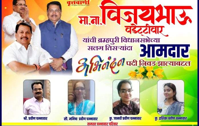 मा. ना. विजय भाऊ वडेट्टीवार यांनी विधानसभेच्या सलग तिसऱ्यांदा आमदार पदी निवड झाल्याबद्दल अभिनंदन