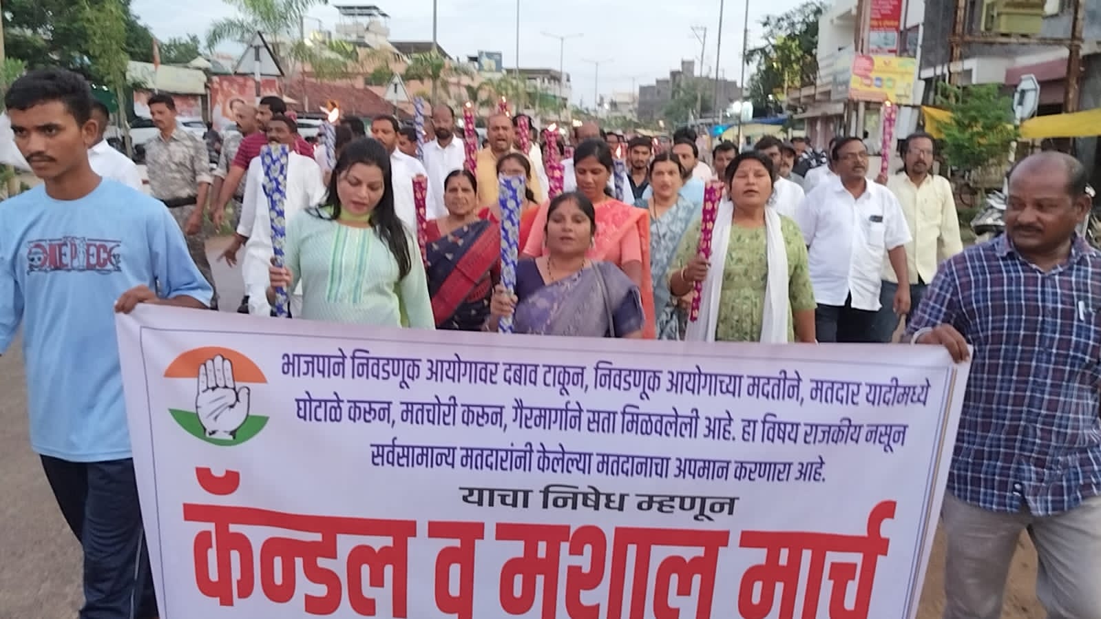 काँग्रेस पक्षाने या मतचोरीचा सातत्याने पर्दाफाश केला असून, जनतेसमोर ठोस पुरावे मांडले आहेत. मतदार यादीतील फेरफार, खोट्या नावांचा समावेश, मतदान केंद्रांवरील अनियमित घटना – या सर्वांमुळे मतदारांच्या पवित्र मतदान अधिकाराचा सरळ अपमान झाला आहे. या गंभीर व लोकशाहीविरोधी प्रकाराचा निषेध नोंदवण्यासाठी आणि जनतेत जागरूकता निर्माण करण्यासाठी गडचिरोली जिल्हा काँग्रेस कमिटीच्या वतीने जिल्हा काँग्रेस कार्यालयापासून इंदिरा गांधी चौकापर्यंत भव्य कॅन्डल व मशाल मोर्चा काढण्यात आला.
