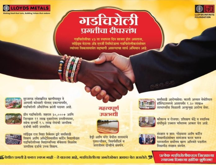लॉयड्स मेटल्स अँड एनर्जी लिमिटेडतर्फे समस्त जिल्हावासीयांना गडचिरोली जिल्हा वर्धापन दिनाच्या हार्दिक शुभेच्छा…!