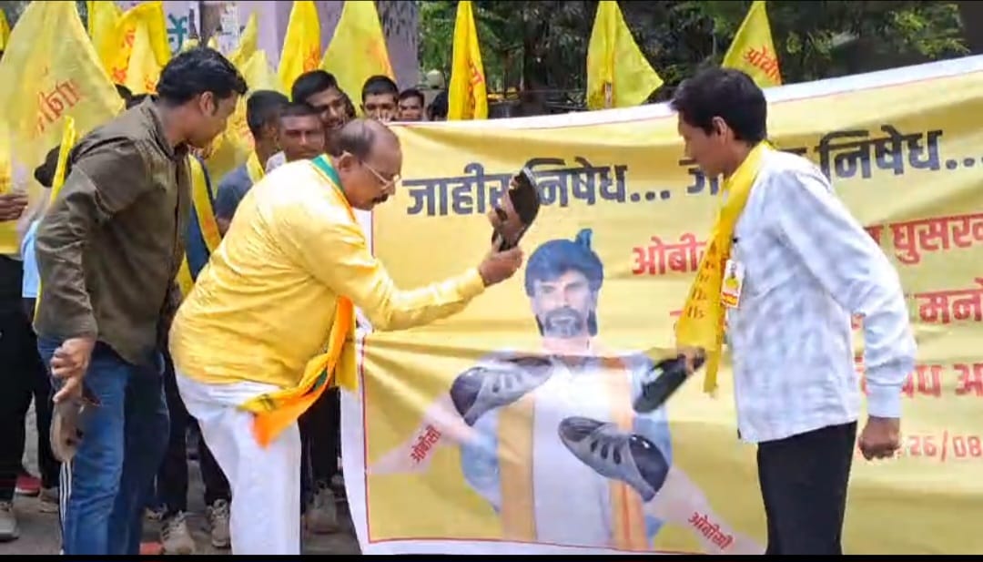 मराठा समाजाला ओबीसीतून आरक्षण मिळावे यासाठी मुंबईला आझाद मैदानावर आंदोलन करण्यासाठी निघालेल्या मनोज जरांगेचा जाहीर निषेध करीत स्थानिक दीक्षाभूमी चौकात आज (दि.२६) ला भारतीय जनता पार्टी ओबीसी मोर्चाचे महाराष्ट्र प्रदेश उपाध्यक्ष डॉ.अशोक जीवतोडे यांच्या नेतृत्वात निषेध आंदोलन करण्यात आले. यावेळी मनोज जरांगेच्या प्रतिमेला चप्पल मारून निषेध नोंदविण्यात आला. आंदोलनात मोठ्या संख्येने ओबीसी समाजबांधव उपस्थित होते.