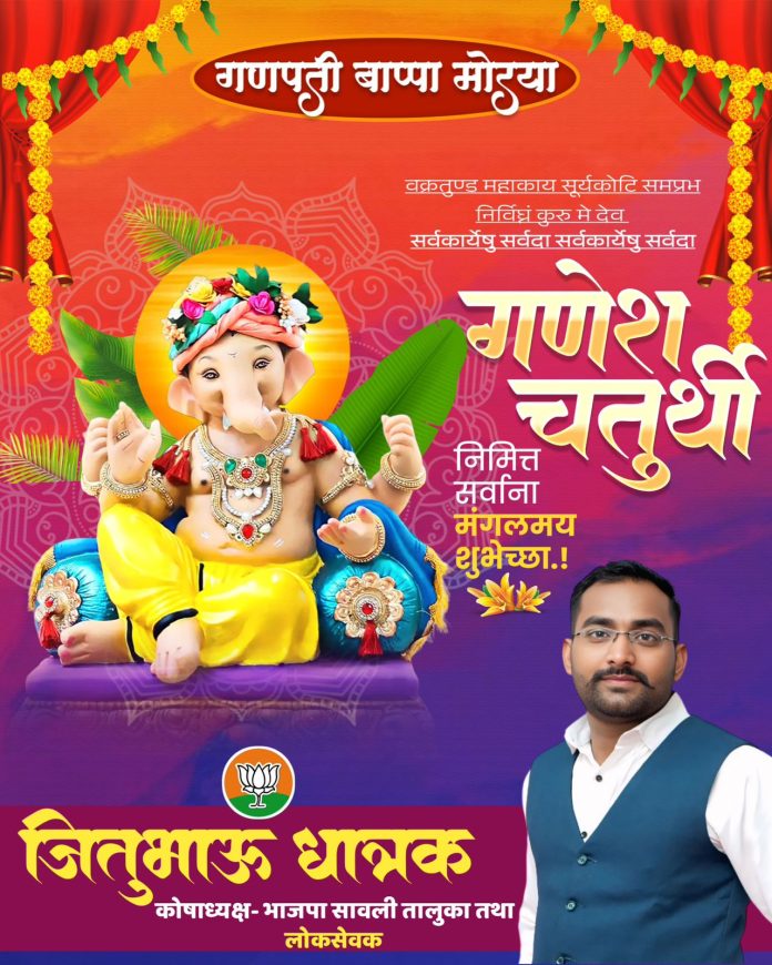 Breaking News गणेश चतुर्थी निमित्त सर्वांना मंगलमय शुभेच्छा! By vrutt wani - August 27, 2025 178 Share WhatsAppFacebookTelegram गणेश चतुर्थी निमित्त सर्वांना मंगलमय शुभेच्छा! शुभेच्छुक मा. जितु भाऊ धात्रक कोषाध्यक्ष, भाजपा सावली तालुका तथा लोकसेवक
