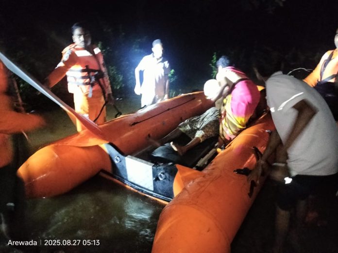 गडचिरोली, दि. २७ (जिमाका): भामरागड तालुक्यातील हिंदेवाडा येथील गर्भवती महिला अर्चना विकास तिम्मा हिला आज दिनांक २७ ऑगस्ट रोजी पहाटे ४.०० वाजता राज्य आपत्ती प्रतिसाद दलाच्या (एस.डी.आर.एफ.) पथकाच्या मदतीने पामूलगौतम नदीच्या पुरातून सुरक्षितपणे बाहेर काढण्यात आले. नदी पार करून तिला तातडीने भामरागड ग्रामीण रुग्णालयात दाखल करण्यात आले असून सकाळी तिने गोंडस कन्येला जन्म दिला आहे.
