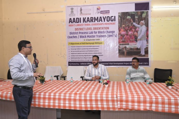 गडचिरोली, दि. ५ (जिमाका): आदिवासी समाजाच्या सर्वांगीण विकासासाठी केंद्र सरकारतर्फे राबविण्यात येणाऱ्या आदि कर्मयोगी अभियान अंतर्गत ब्लॉक मास्टर ट्रेनरचे तीन दिवशीय प्रशिक्षण कालपासून सुरू झाले. सेमाना रोडवरील एकलव्य मॉडेल रेसीडेन्शियल स्कूल येथे प्रकल्प अधिकारी रणजित यादव यांच्या हस्ते तर अहेरी येथे प्रकल्प अधिकारी कुशल जैन यांच्या हस्ते या प्रशिक्षणाचा शुभारंभ करण्यात आला.