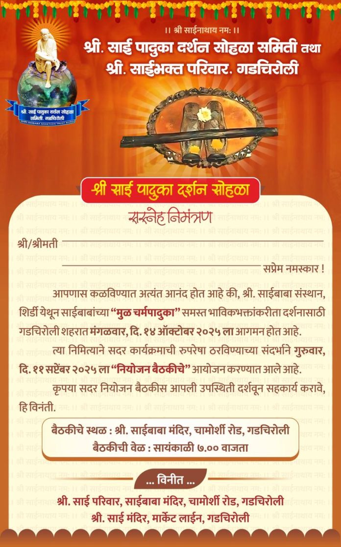 श्री. साईबाबा संस्थान, शिर्डी येथून साईबाबांच्या “मुळ चर्मपादुका” समस्त भाविकभक्तांकरीता दर्शनासाठी गडचिरोली शहरात मंगळवार, दि. १४ ऑक्टोबर २०२५ ला आगमन होत आहे.