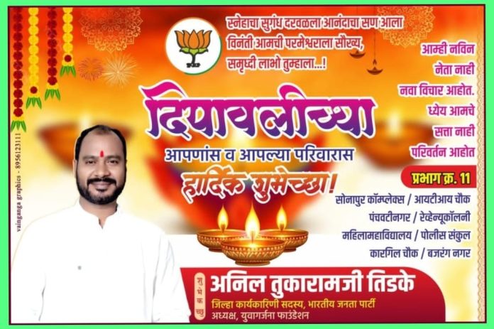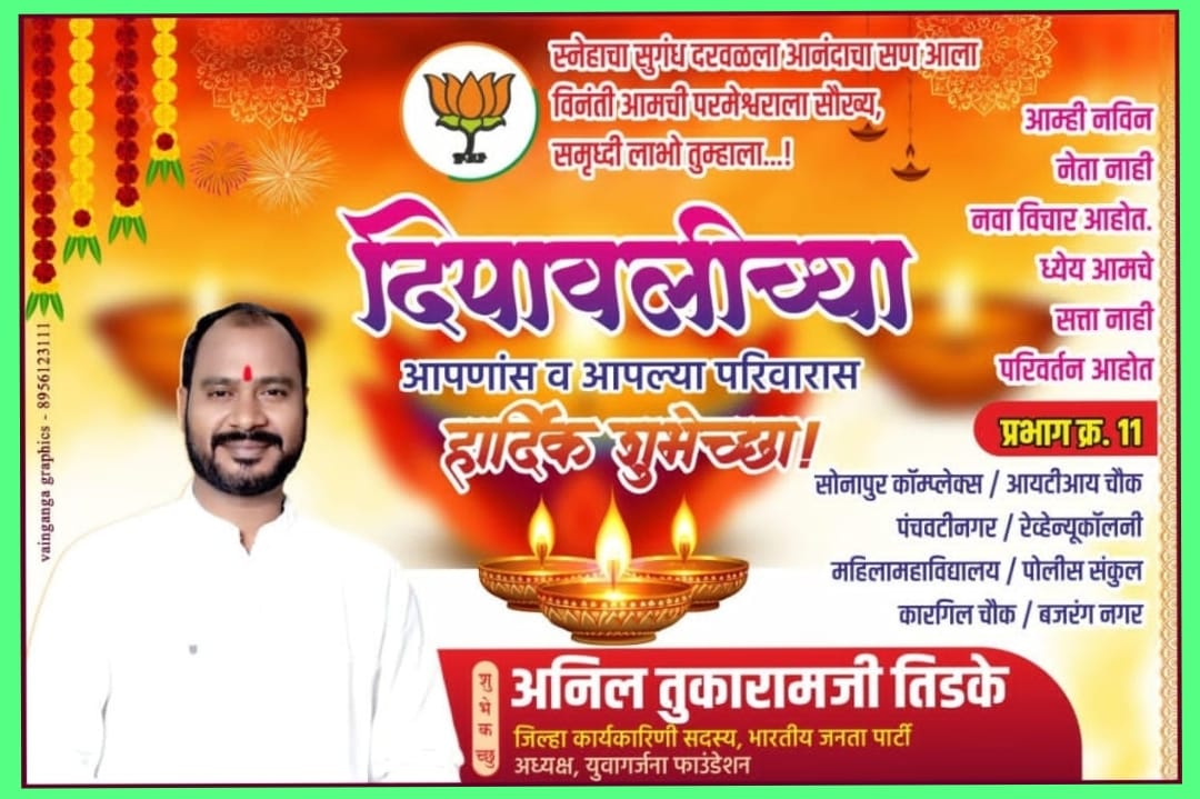 Breaking News दिपावलीच्या आपणास व आपल्या परिवारास हार्दिक शुभेच्छा! शुभेच्छुक अनिल तुकारामजी तिडके जिल्हा कार्यकारिणी सदस्य भारतीय जनता पार्टी अध्यक्ष, युवा गर्जना फाउंडेशन By vrutt wani - October 19, 2025 95 Share WhatsAppFacebookTelegram दिपावलीच्या आपणास व आपल्या परिवारास हार्दिक शुभेच्छा! शुभेच्छुक अनिल तुकारामजी तिडके जिल्हा कार्यकारिणी सदस्य भारतीय जनता पार्टी अध्यक्ष, युवा गर्जना फाउंडेशन