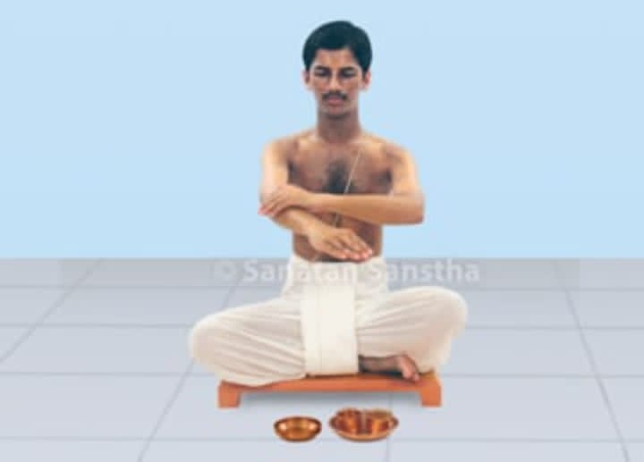 ११. काखेपासून कमरेपर्यंत : काखेपासून पितृतीर्थासारखा हात, म्हणजेच अंगठा एका बाजूला अन् चार बोटे दुसर्याम बाजूला ठेवून अंगाच्या दोन्ही बाजूच्या रेषेवरून वरून खाली या पद्धतीने फिरवावेत.