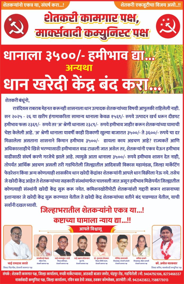 याबाबत जिल्हाभरातील धान उत्पादक शेतकऱ्यांना आवाहन करताना डाव्या पक्षांची म्हटले आहे की, रात्रंदिवस राबराब मेहनत करूनही शासनाला धान उत्पादक शेतकऱ्यांच्या विषयी आपुलकी राहिलेली नाही. सन २०२५ – २६ या खरीप हंगामाकरिता सामान्य धानाला केवळ १५६९/- रुपये उत्पादन खर्च धरून दीडपट हमीभाव फक्त २३६९/- रुपये तर ‘अ’ श्रेणी धानाला २३८९/- रुपये हमीभाव जाहीर करून शेतकऱ्यांच्या घामाची शासनाने चेष्टा केलेली आहे. ‘अ’ श्रेणी धानाला यावर्षी काही ठिकाणी खुल्या बाजारात ३५००/- ते ३६००/- रुपये चा दर मिळालेला असताना शासनाला किमान हमीभाव ३५००/- द्यायला काय अडचण आहे? असा सवालही करण्यात आला आहे.