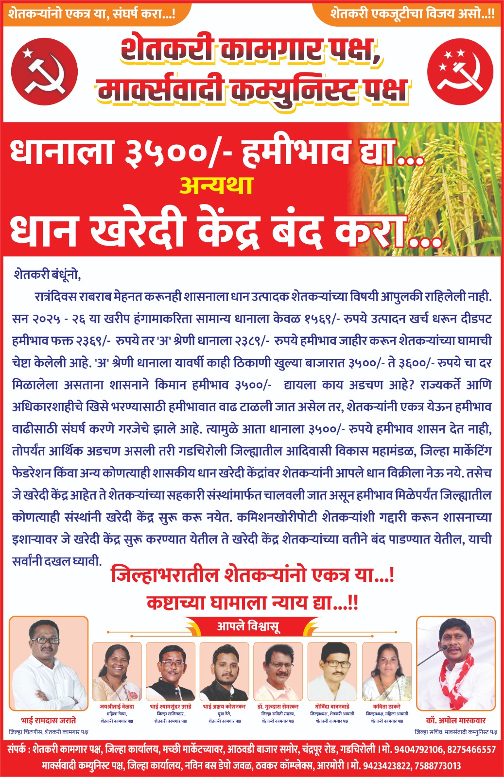 तसेच जिल्ह्यात जे खरेदी केंद्र आहेत ते शेतकऱ्यांच्या सहकारी संस्थांमार्फत चालवली जात असून हमीभाव मिळेपर्यंत जिल्ह्यातील कोणत्याही संस्थांनी खरेदी केंद्र सुरू करू नये. कमिशनखोरीपोटी शेतकऱ्यांशी गद्दारी करून शासनाच्या इशाऱ्यावर जे खरेदी केंद्र सुरू करण्यात येतील ते खरेदी केंद्र शेतकऱ्यांच्या वतीने बंद पाडण्यात येतील, असा इशारा देवून जिल्हाभरातील शेतकऱ्यांनी साडेतीन हजार रुपये हमीभावासाठी एकत्र येण्याचे आवाहनही शेतकरी कामगार पक्षाचे जिल्हा चिटणीस भाई रामदास जराते, मार्क्सवादी कम्युनिस्ट पक्षाचे जिल्हा सचिव काॅ. अमोल मारकवार, भाई शामसुंदर उराडे, जयश्रीताई वेळदा, भाई अक्षय कोसनकर, शेतकरी आघाडीचे जिल्हाध्यक्ष गोविंदा बाबनवाडे, महिला जिल्हाध्यक्षा कविता ठाकरे, जिल्हा समिती सदस्य डाॅ. गुरुदास सेमस्कर, अशोक किरंगे, चंद्रकांत भोयर, तुळशिदास भैसारे, पांडुरंग गव्हारे, दामोदर रोहणकर, चिरंजीव पेंदाम,पवित्र दास, प्रभाकर गव्हारे, शर्मीश वासनिक, डंबाजी भोयर, रामदास आलाम व पदाधिकाऱ्यांनी दिला आहे.