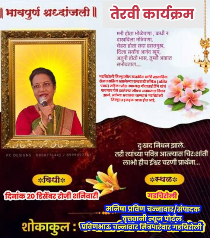अध्यक्ष आधारविश्व फाउंडेशनच्या अध्यक्ष तथा राष्ट्रवादी काँग्रेस पक्षाचे महिला प्रदेश उपाध्यक्ष गीता सुशील हिंगे यांच्या तेरवी निमित्ताने प्रवीणभाऊ चन्नावार मित्रपरिवार मनिषा प्रविण चन्नावार संपादक वृत्तवानी न्यूज पोर्टल तर्फे त्यांच्या पवित्र आत्म्यास चिर:शांती लाभो हीच ईश्वरचरणी प्रार्थना…