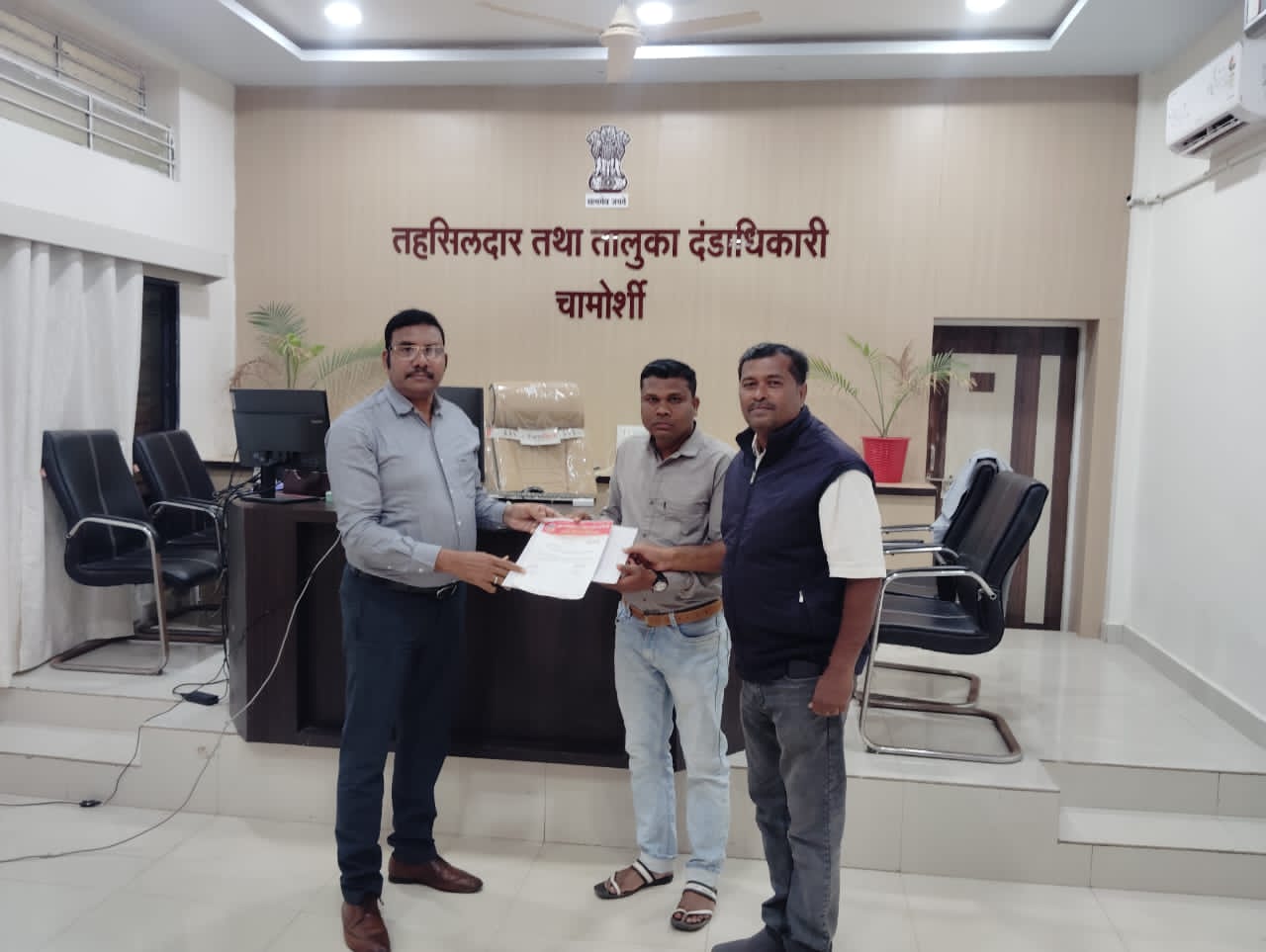 दिनांक 23 डिसेंबर 2025 चामोर्शी तालुक्यातील सुभाषग्राम ग्रामपंचायत अंतर्गत मौजा नरेंद्रपूर ठाकूरनगर. तुंबडी येथील घरकुलधारकांना रेती उपसा करण्यासाठी घाट उपलब्ध न झाल्याने येथील सर्वसामान्य गोरगरीब घरकुल धारक जनतेला खूप त्रास सहन करावा लागत होता तसेच डबल किंमत मोजून रेती घ्यावी लागत होती या सर्व विषयाची दखल घेऊन राष्ट्रीय मानवाधिकार संघटनेचे प्रदेशाध्यक्ष डॉ.प्रणय खुणे यांच्या मार्गदर्शनाखाली चामोर्शी येथील तहसीलदार घारुडे साहेब यांची भेट घेऊन सविस्तर चर्चा करण्यात आले व राष्ट्रीय मानवाधिकार संघटनेच्या वतीने त्यांना निवेदन देण्यात आले यावेळी तहसीलदार घारुडे साहेब यांनी सकारात्मक प्रतिसाद देत लवकरच तालुका प्रशासनाच्या वतीने येथील घरकुलधारकांना तुंबडी रेती घाट उपलब्ध करून देन्यात येईल असे प्रतिपादन केले यावेळी राष्ट्रीय मानवाधिकार संघटनेचे जिल्हाध्यक्ष रमेश अधिकारी राष्ट्रीय मानवाधिकार संघटनेचे जिल्हा उपाध्यक्ष किशोर कुंडू, तालुका सचिव संतोष बुरांडे व पदाधिकारी कार्यकर्ते उपस्थित होते.