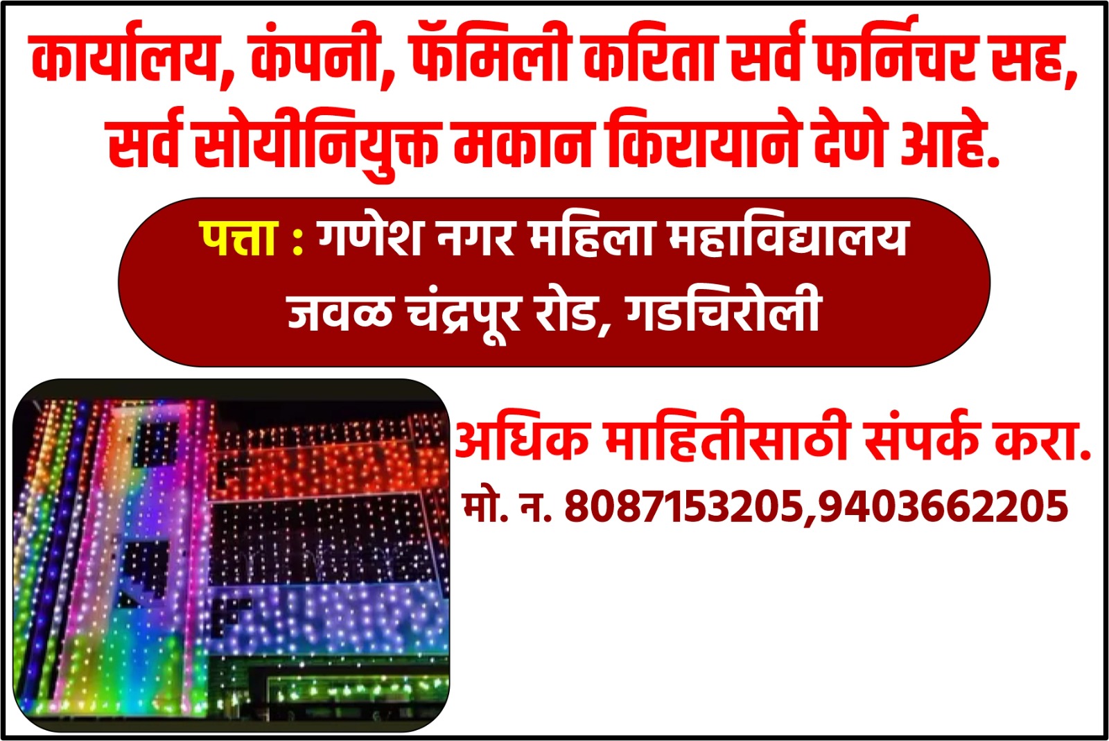 कार्यालय, कंपनी, फॅमिली करिता सर्व फर्निचर सह, सर्व सोयीनियुक्त मकान किरायाने देणे आहे