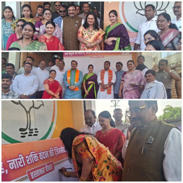 *पंतप्रधान मा. नरेंद्रजी मोदी यांच्या नेतृत्वाखाली महिलांना राजकारणात समान संधी मिळावी या उद्देशाने हे विधेयक मंजूर करण्यात आले आहे. स्वाक्षरी मोहिमेद्वारे या विधेयकाला समर्थन देण्यात येत असून महिलांच्या राजकीय सक्षमीकरणासाठी आणि निर्णय प्रक्रियेत त्यांचा सहभाग वाढविण्यासाठी हे विधेयक महत्त्वपूर्ण पाऊल ठरणार असल्याचे मत यावेळी उपस्थित मान्यवरांनी व्यक्त केले.*