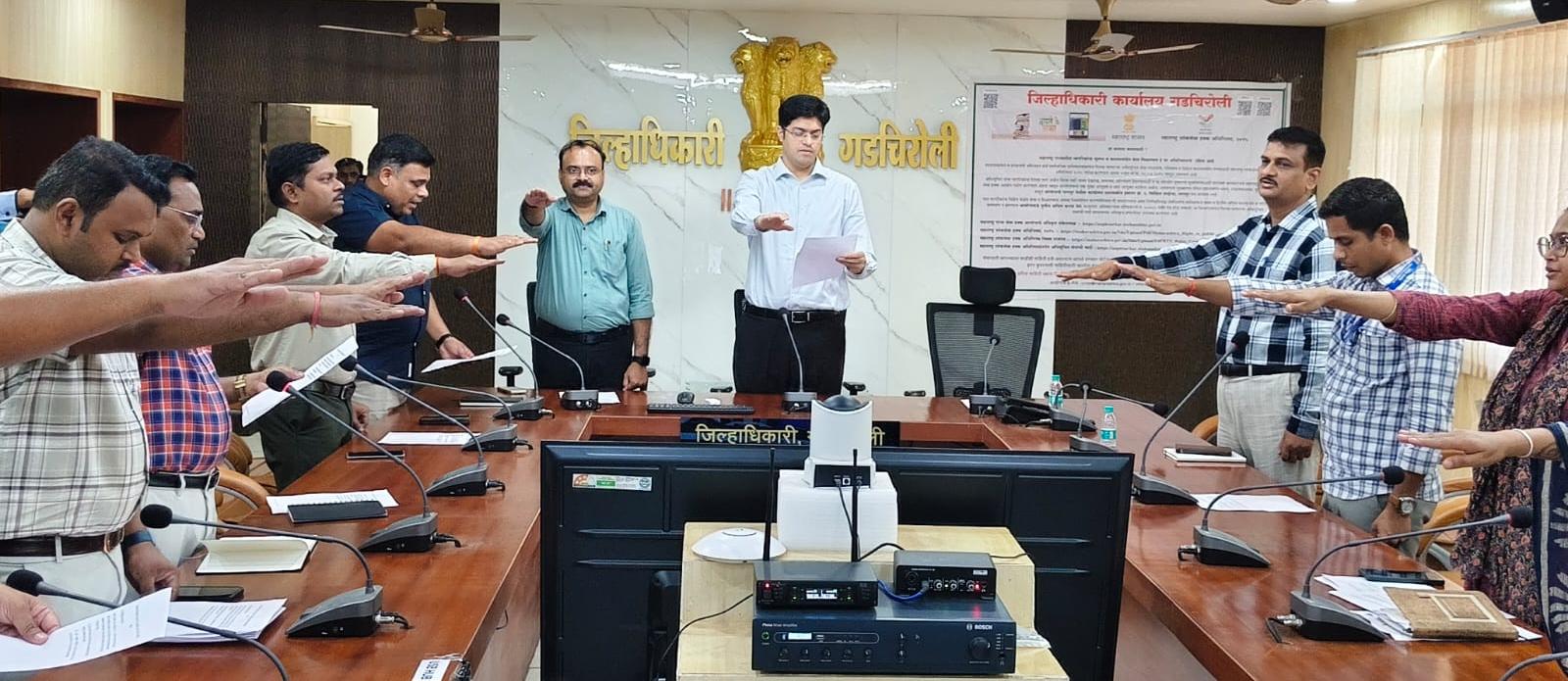 गडचिरोली, (जिमाका) दि. 28 : सेवा हक्क दिनानिमित्त आज जिल्हाधिकारी कार्यालय, गडचिरोली येथे अधिकारी व कर्मचाऱ्यांना महाराष्ट्र लोकसेवा हक्क अधिनियम २०१५ अंतर्गत नागरिकांना पारदर्शक, वेळेत व सुलभ सेवा देण्याची शपथ देण्यात आली. जिल्हाधिकारी अविश्यांत पंडा यांनी उपस्थितांना शपथ देत सेवा वितरण प्रक्रियेत पारदर्शकता, वेळेचे काटेकोर पालन आणि नागरिकाभिमुख दृष्टीकोन ठेवण्याचे मार्गदर्शन केले.