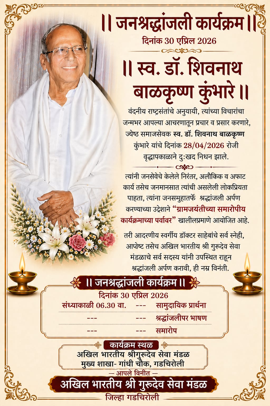गडचिरोली (प्रतिनिधी)- येथील थोर समाजसेवी व्यक्तिमत्व, विविध सामाजिक व धार्मिक , सांस्कृतिक संस्थाचे मार्गदर्शक, अ. भा. श्रीगुरुदेव सेवा मंडळाचे माजी जिल्हा सेवाधिकारी डॉ. शिवनाथजी कुंभारे (गडचिरोली) यांचे काल गडचिरोली येथे निवासस्थानी निधन झाले आणि त्यांचेवर कठाणी नदी घाटावरील स्मशानभूमीत त्यांच्यावर अंत्यसंस्कार करण्यात आले.